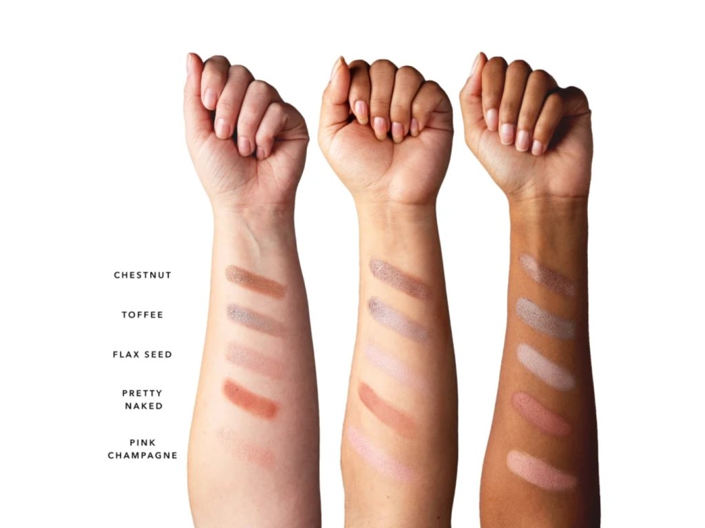 Paletka obsahuje: Rozjasňující pudr Pink Champagne, Pudrovou tvářenku Pretty Naked, Pudrové oční stíny Flax Seed, Toffee, Chestnut.